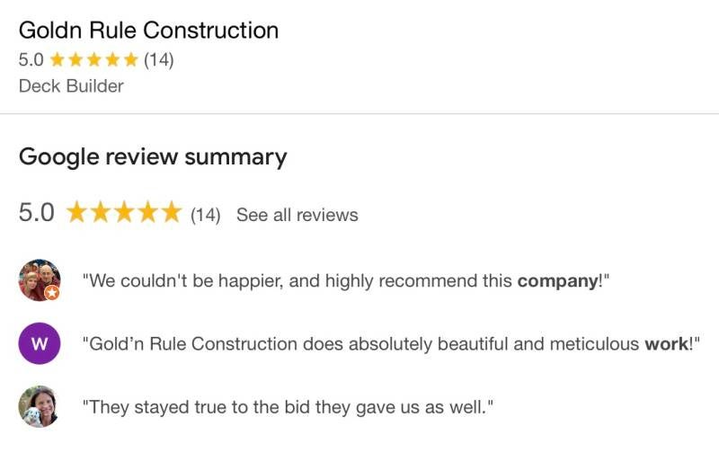 "Gold'n Rule Construction does absolutely beautiful and meticulous work! If you're looking for someone to do a job right and not cut any corners, this is it! The highest quality materials and labor go into everything they do. I highly recommend Gold'n Rule Construction to anyone looking to have a beautiful deck built (or other construction work done) that will last for years!